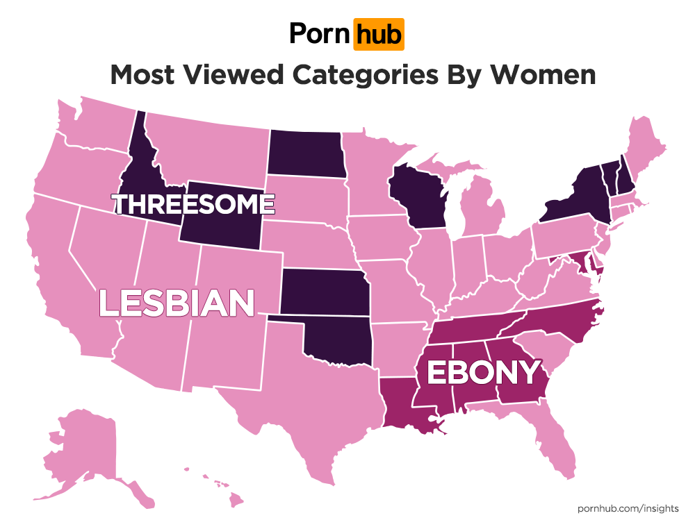 Across most of the United States, Lesbian is the most viewed category, but in the Southern states women prefer Ebony videos. In parts of the West, Midwest and Northeast, Threesome videos are the most watched by women.